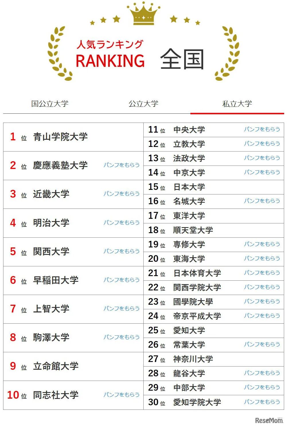 最新全日本大学排名中,国立大学第 1 名为东京大学,公立大学第 1 名为大阪公立大学,私立大学第 1 名为青山学院大学。与上一次(2026 年 2 月版)调查相比,私立大学中,上次并列第 9 的同志社大学排名下滑,变为第 9 名立命馆大学、第 10 名同志社大学。除此之外并无其他变动,国公私各校前 30 名依旧保持原有阵容。
